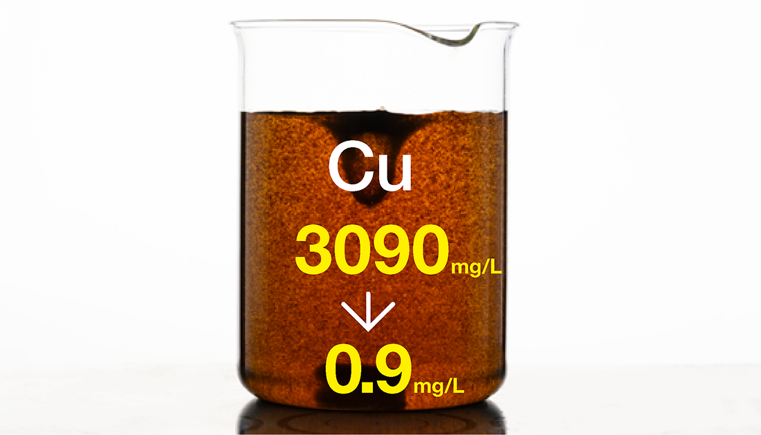 In this application, copper concentration was reduced from 3090 mg/L to 0.9 mg/L following treatment. This result was achieved even with highly concentrated, complex wastewater.