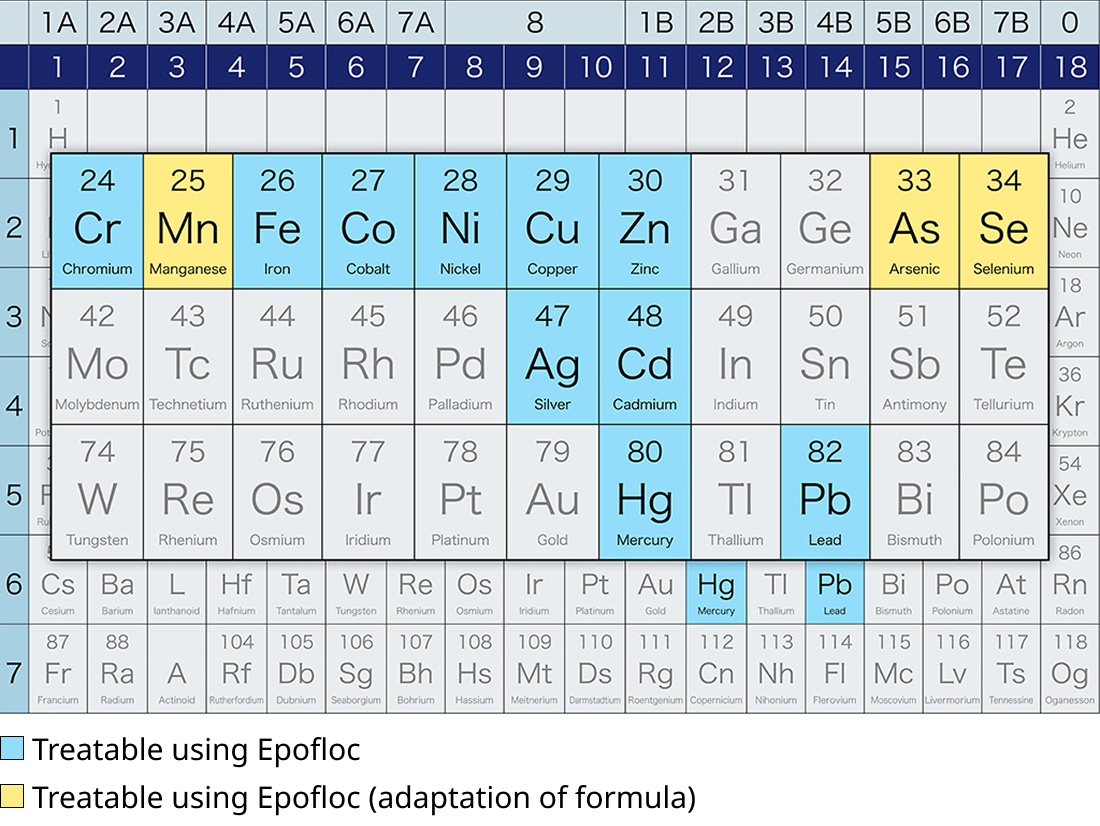 EPOFLOC demonstrates broad reactivity across a wide spectrum of heavy metals, including Chromium (Cr), Manganese(Mn), Iron (Fe), Cobalt (Co), Nickell (Ni), Copper (Cu), Zinc (Zn), Arsenic (As), Selenium (Se), Silver (Ag), Cadmium (Cd), Mercury (Hg), and Lead (Pb). Because it is able to bind to multiple elements simultaneously, EPOFLOC can eliminate the need to treat metals individually.