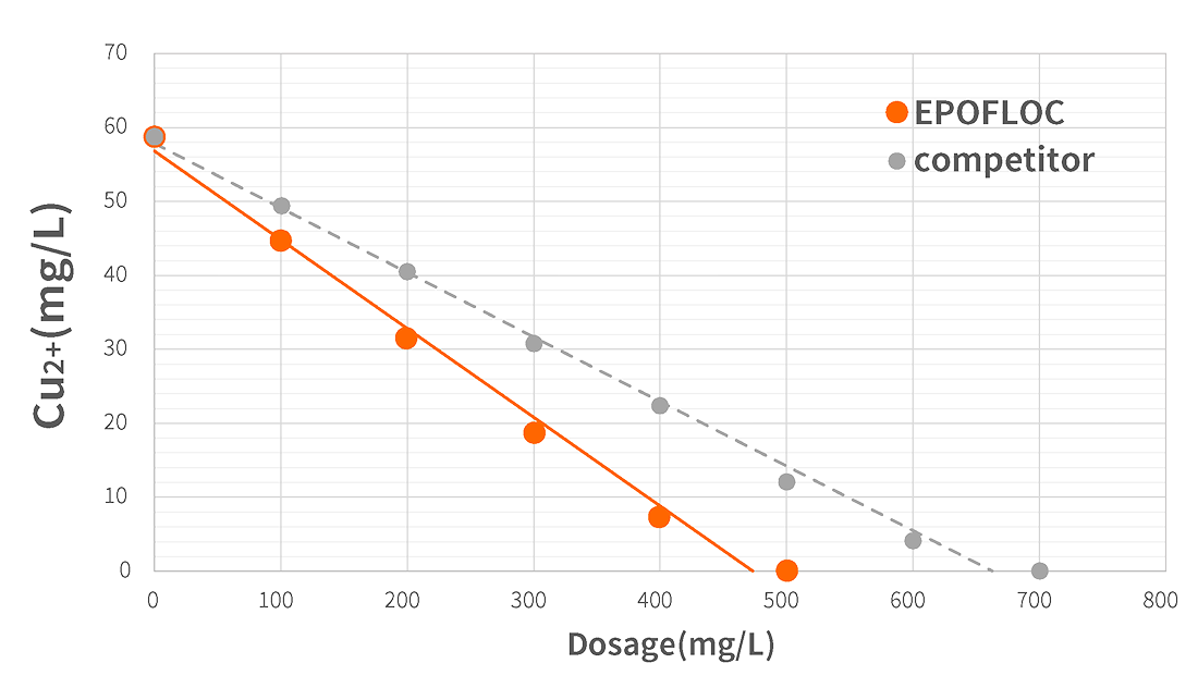 EPOFLOC demonstrates high reactivity and delivers effective treatment at low dosage levels. In copper removal tests, it successfully reduced concentrations far below the discharge standard of 3 mg/L, reaching 0.02 mg/L or less, while requiring 200 mg/L less dosage than alternative products.