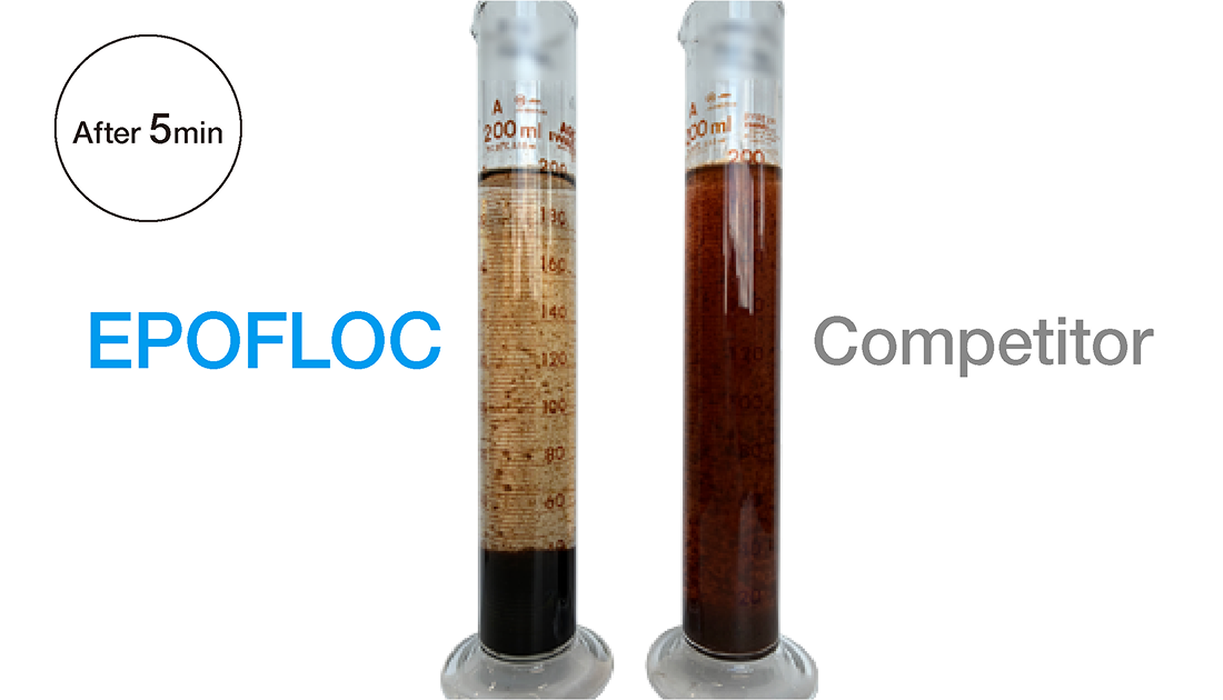 EPOFLOC produces large, stable flocs that promote rapid sludge settling and efficient solid-liquid separation. In testing, noticeable settling behavior occurred within five minutes of application, supporting faster and more effective treatment performance.