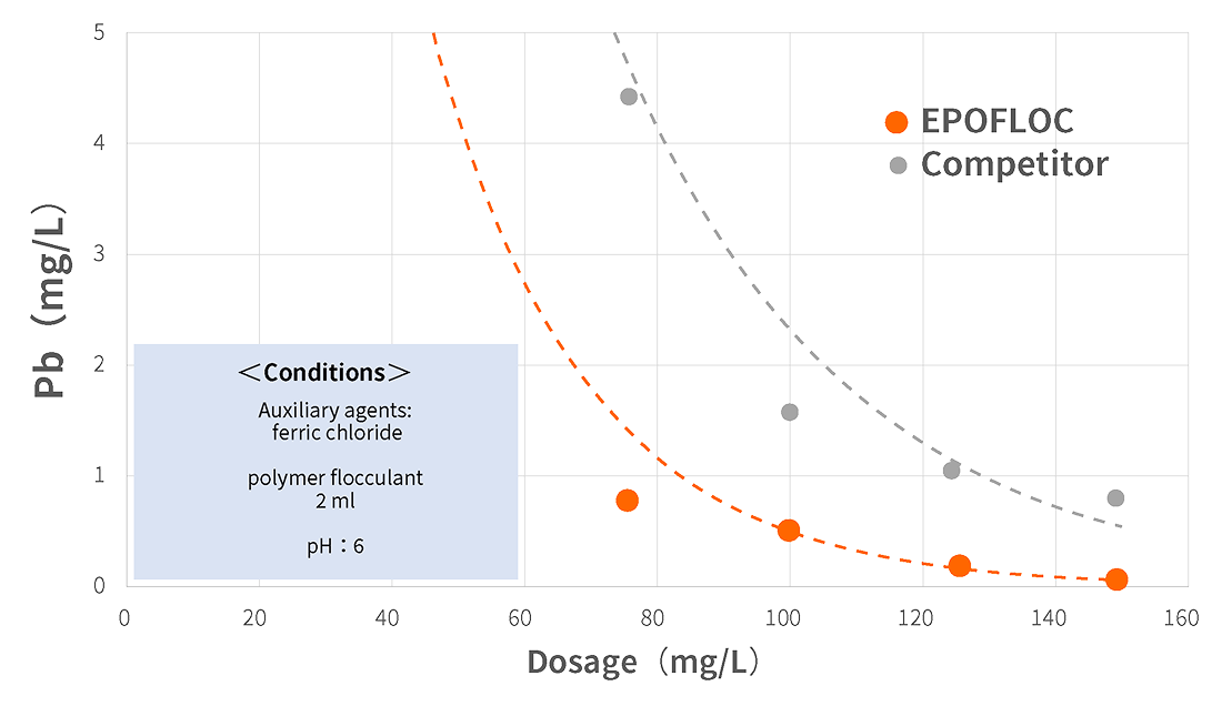 In lead wastewater treatment, EPOFLOC achieves superior removal performance while requiring a lower dosage than competing products.