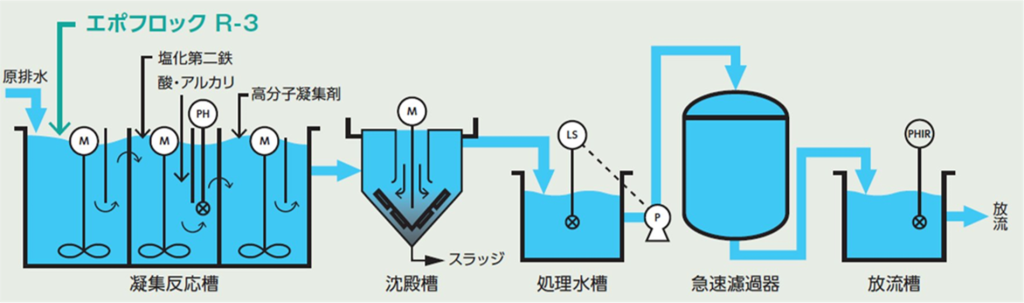 エポフロックは排水処理フローにおいて原水が流入する最初の槽で添加します。