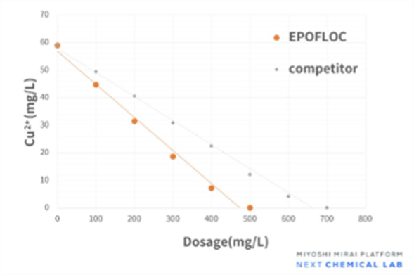 エポフロックは高い反応性を持ち、少量の添加で高い処理効果を発揮します。銅の処理試験では、排水基準である3mg/Lを大きく下回る0.02mg/L以下に抑えるための添加量が、他の凝集剤より200mg/L少なく済むことが確認されました。