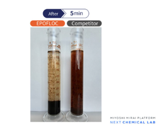 大きく安定したフロックを形成し、スラッジの沈降が速いため固液分離が容易です。試験では、添加後5分で明確な沈降差が確認され、処理工程の迅速化に貢献します。