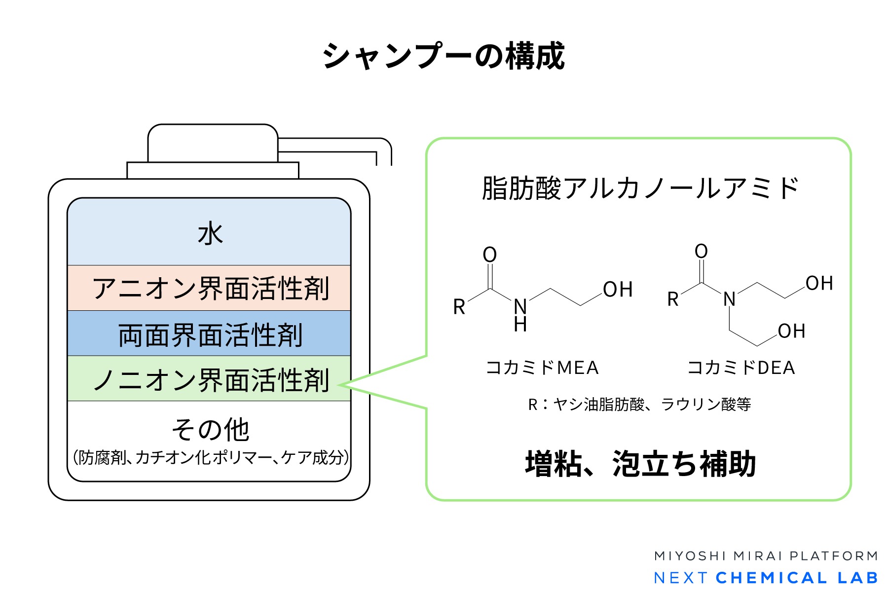 脂肪酸アルカノールアミドは、シャンプーなどの化粧品に使用されるノニオン(非イオン性)界面活性剤の一種です。主に製品の粘度調整や泡立ちの補助といった機能を担います。