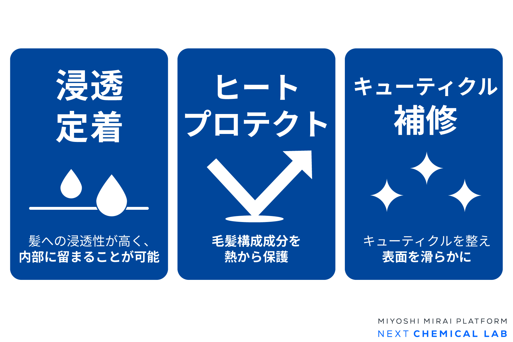 また、製品タイプに応じて、ヘアケア用途では有効成分の毛髪への浸透促進・定着、ヒートプロテクト、保湿などの機能・効果を、スキンケア用途では高い水分保持力によるうるおい維持や、美白成分を含む処方の安定性向上といった機能・効果を発揮します。