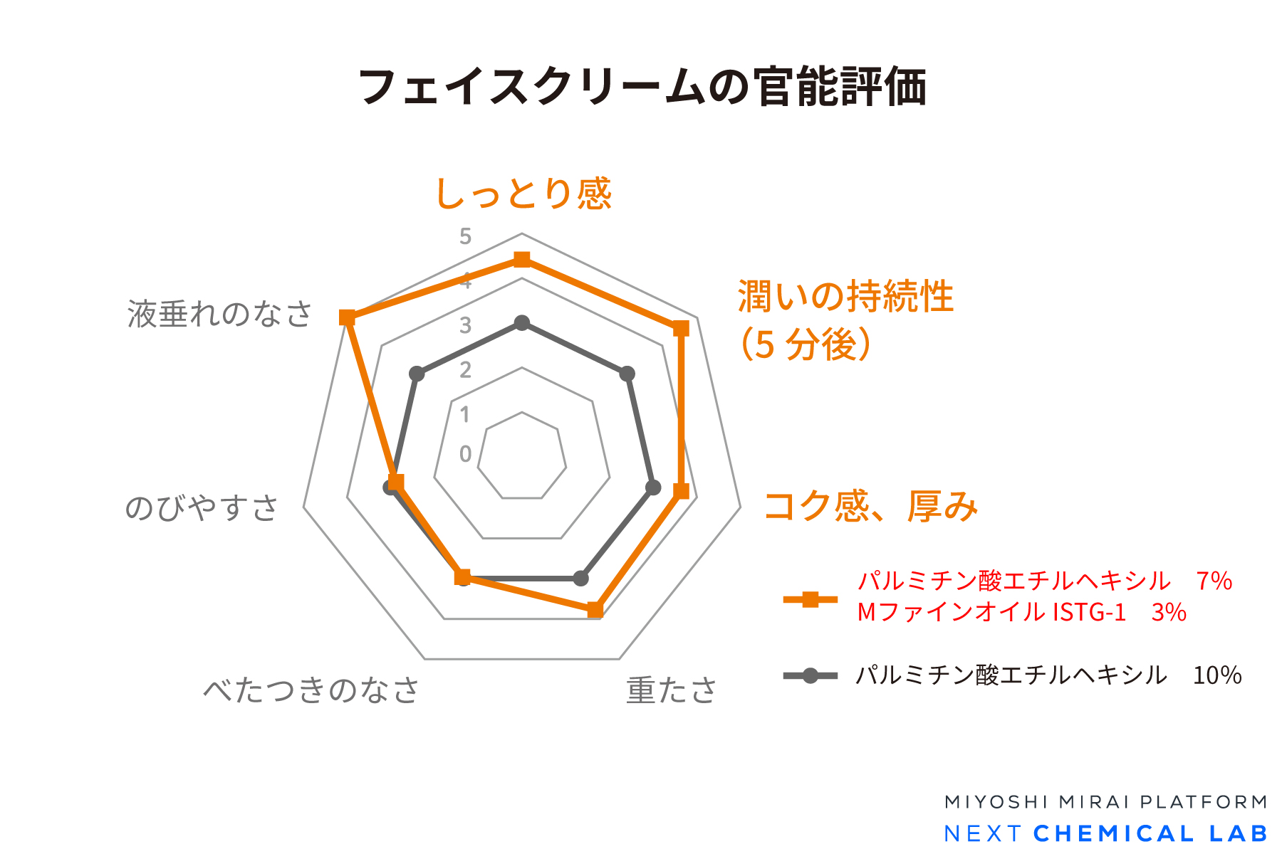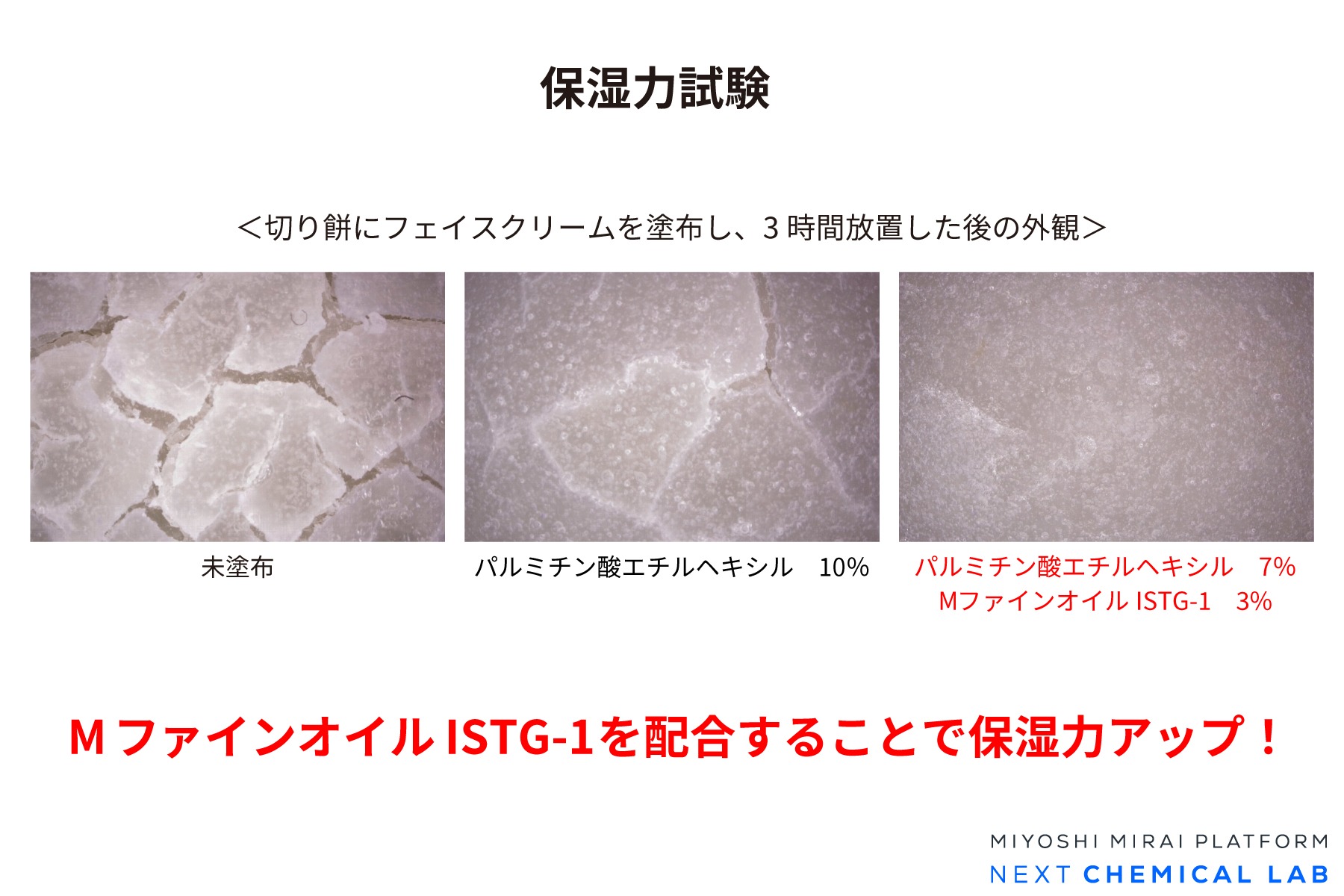 他油剤の一部をMファインオイルISTG-1に置き換えることで、べたつきを抑えつつ、しっとり感を付与できます。