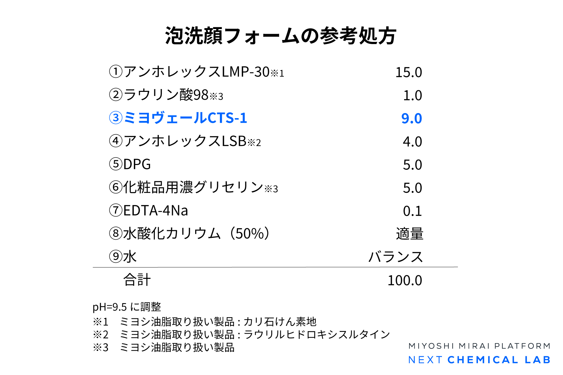 ミヨヴェールCTS-1の起泡性の良さを生かし、泡立ち豊かな泡洗顔を実現できます。