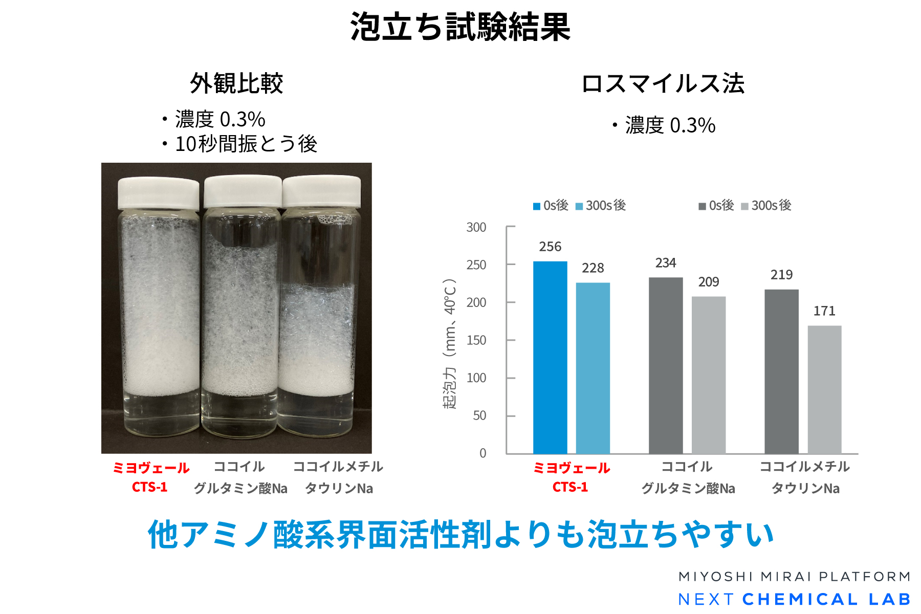 他のアミノ酸系界面活性剤と比較して、ミヨヴェールCTS-1の泡はきめ細かく、持続性も良好です。