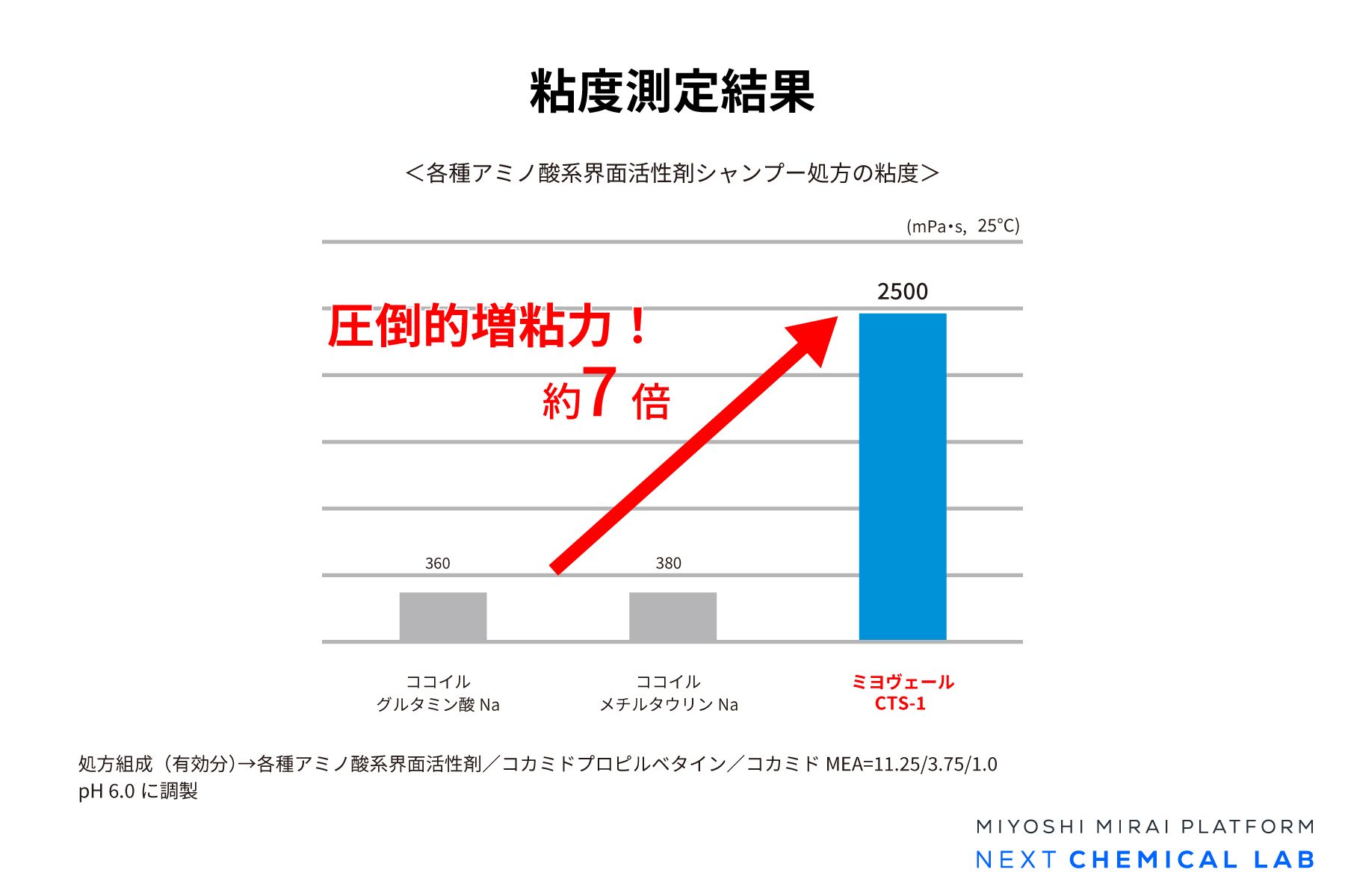 ミヨヴェールCTS-1は他のアミノ酸系界面活性剤に比べて約7倍も増粘性があります。