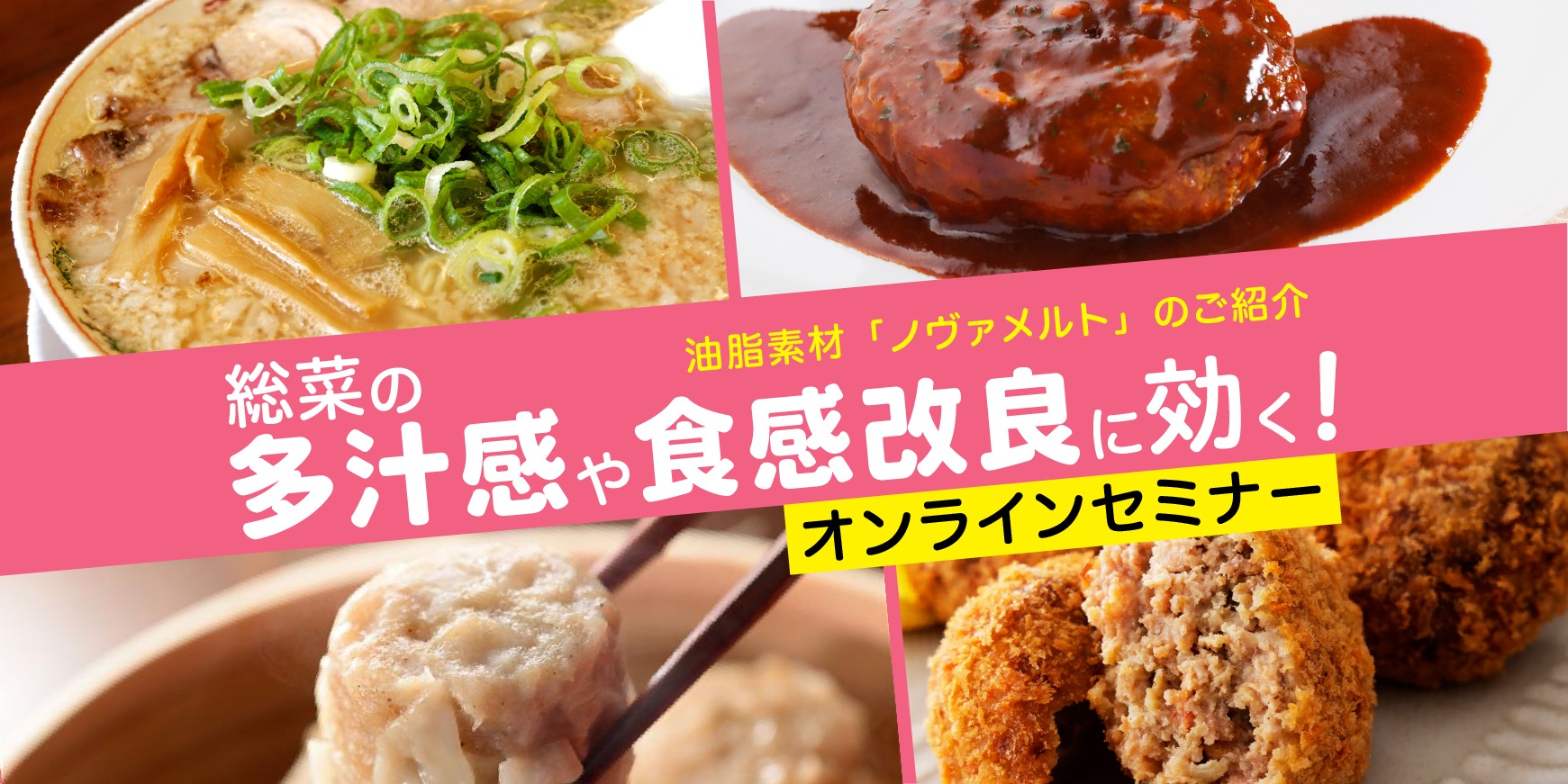 本セミナーでは、ハンバーグなどの総菜への応用事例を交えながら、製品の特長と導入メリットをご紹介します。