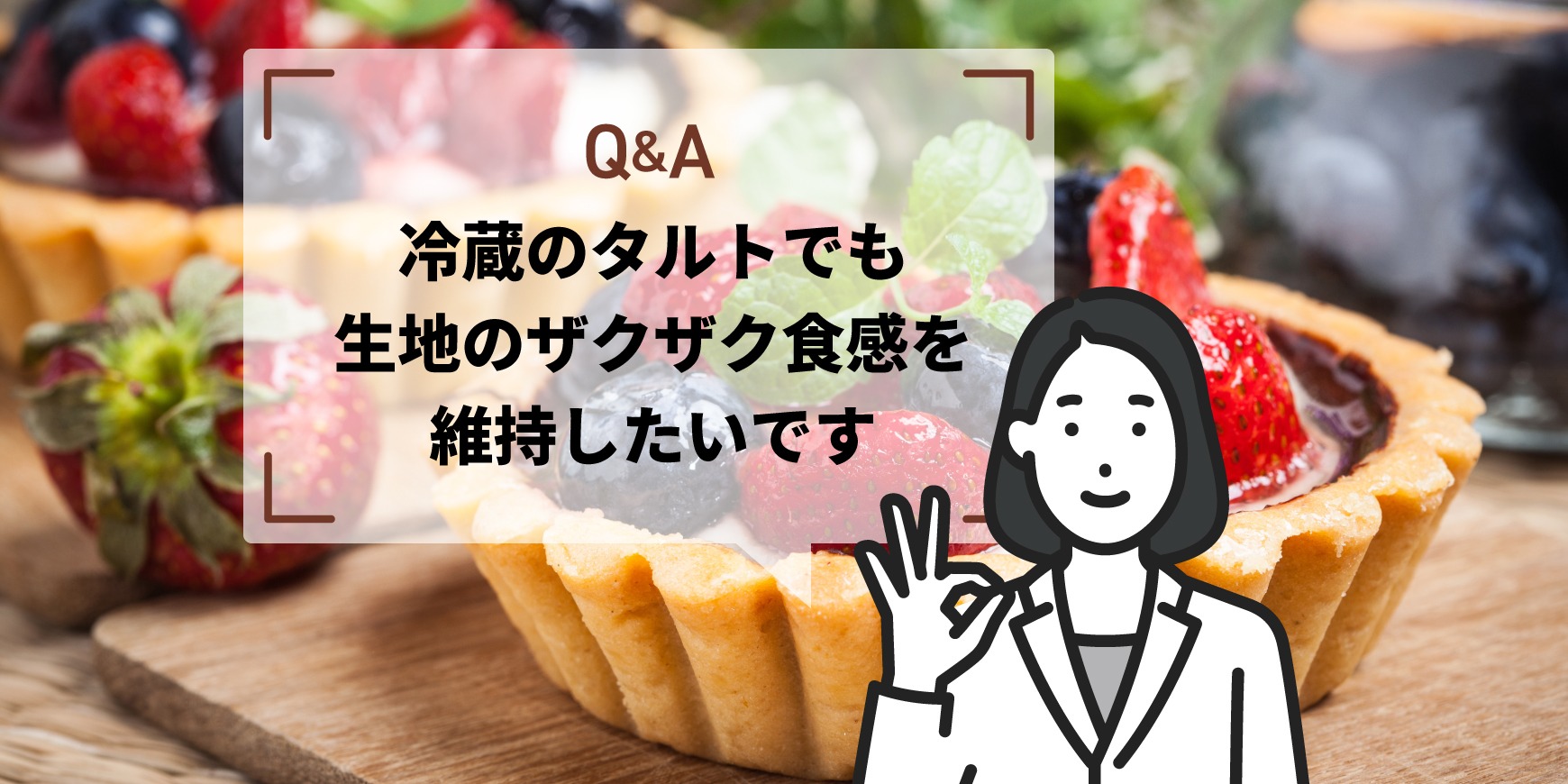 A:「クラップ」を使用することで、冷蔵のタルトでも水分移行による食感低下を抑え、タルト生地のザクザク食感を維持できます。