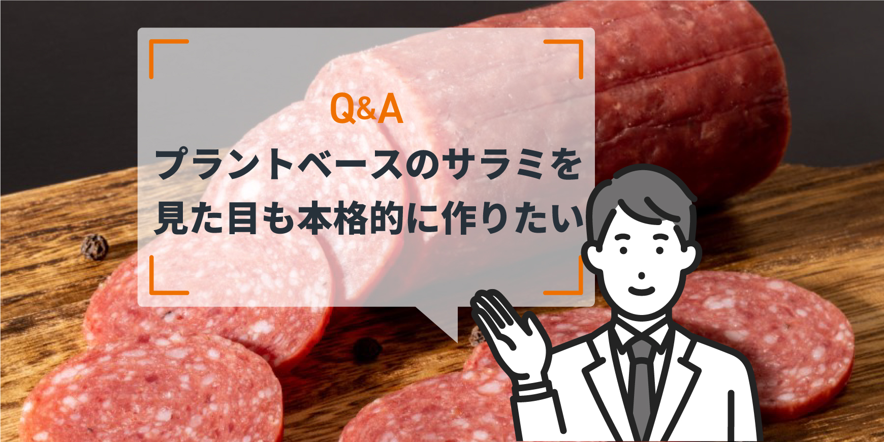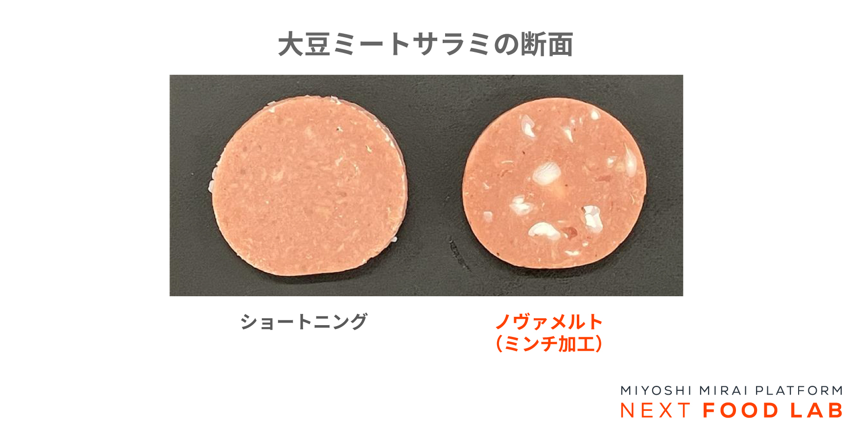 A:「ノヴァメルト」を使用することで、加熱後もサラミ内に脂身のように点在し、見た目も味もメリハリのある、より本格的なプラントベースサラミになります。