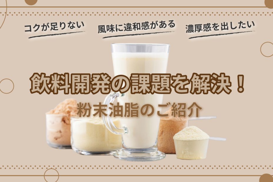 飲料は、見た目の発色や濃厚感、のどごし、製造時の泡立ちや健康訴求の商品づくりなどが課題となります。飲料の中でも、植物性ミルクは独特の風味や舌ざわりが、プロテイン飲料は粉の溶けやすさや泡立ち、風味が課題となります。
